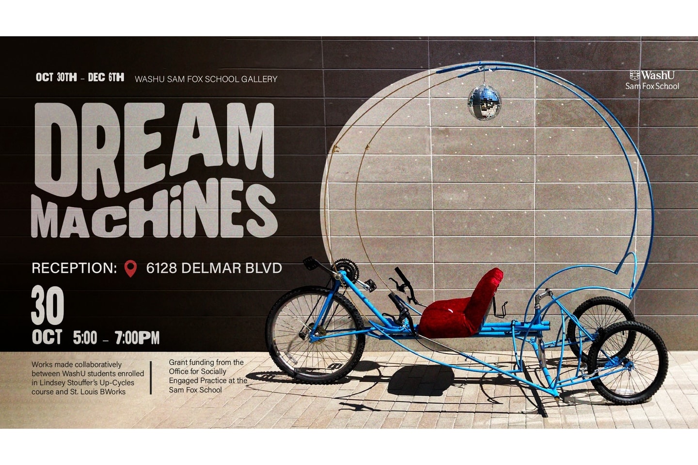Dream Machines showcases discarded bicycles transformed into imaginative, fully functional human-powered vehicles through a collaboration between Sam Fox School students enrolled in Lindsey Stouffer’s course Upcycles: Form, Function, and Design, and St. Louis BWorks alumni. The project combines design, fabrication, and community engagement, and celebrates creativity, technical skill, and empowerment. Visitors are invited to experience the intersection of art, engineering, and social engagement, and to see how thoughtful design can transform both objects and lives.
