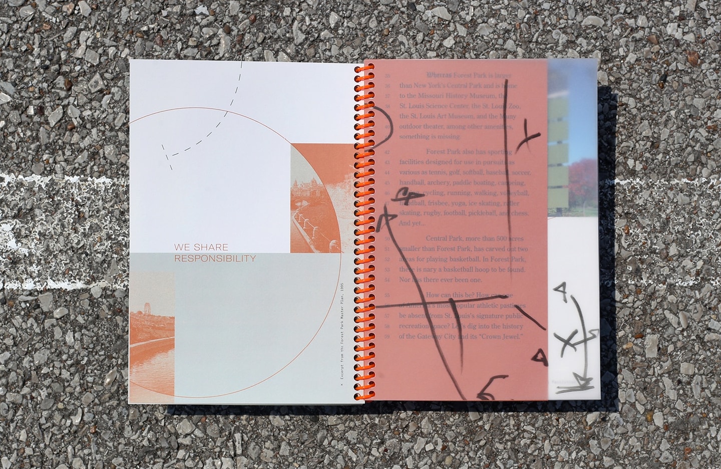 Artist book created with John Early and Noah Cohan for their activist effort Whereas Hoops. Whereas Hoops calls our attention to the lack of basketball courts in Forest Park, linking it to the complex history of racial relations in St. Louis and the veil of prejudice that overlays the relationship of the city and the sport of basketball. (6×8.75 in, 54pp)