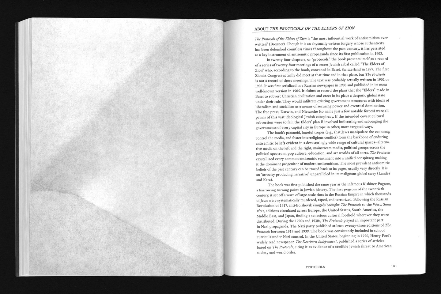 Daniela Naomi Molnar’s Protocols: An Erasure is a book-length erasure poem that redacts the antisemitic document The Protocols of the Elders of Zion. Drawing light from darkness, Molnar’s work is a meticulous, questioning, sensitive, and searing act that mines meaning and depth from a document so flat, fictitious, and dangerous. Inhabiting a structure of ennumerated “Protocols,” the poem beats rhythmically across the page, punctuating the surgically intentional erasure inherent to the poet’s process. Meaning is palpable in the spaces that surround the words and lines that wind through the book’s pages.