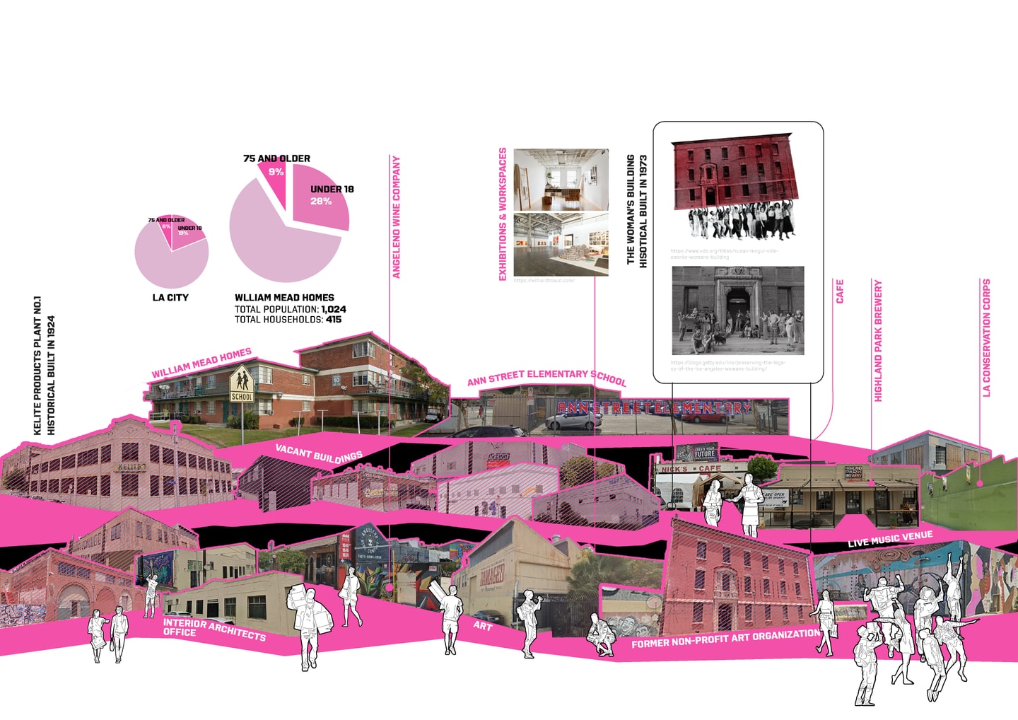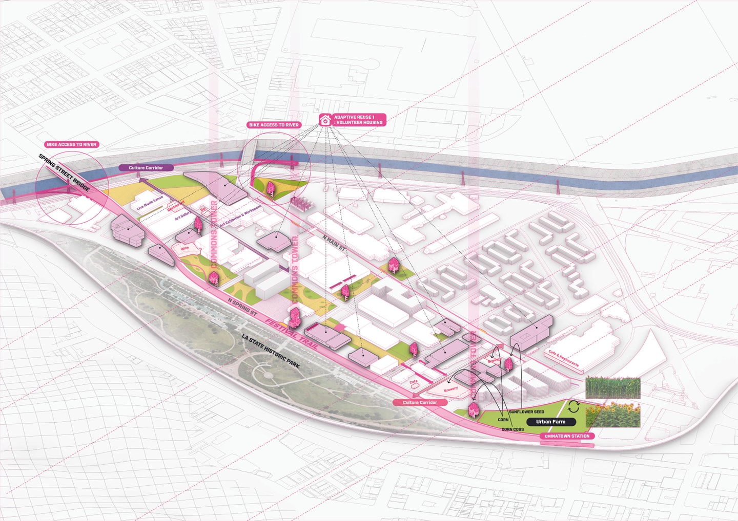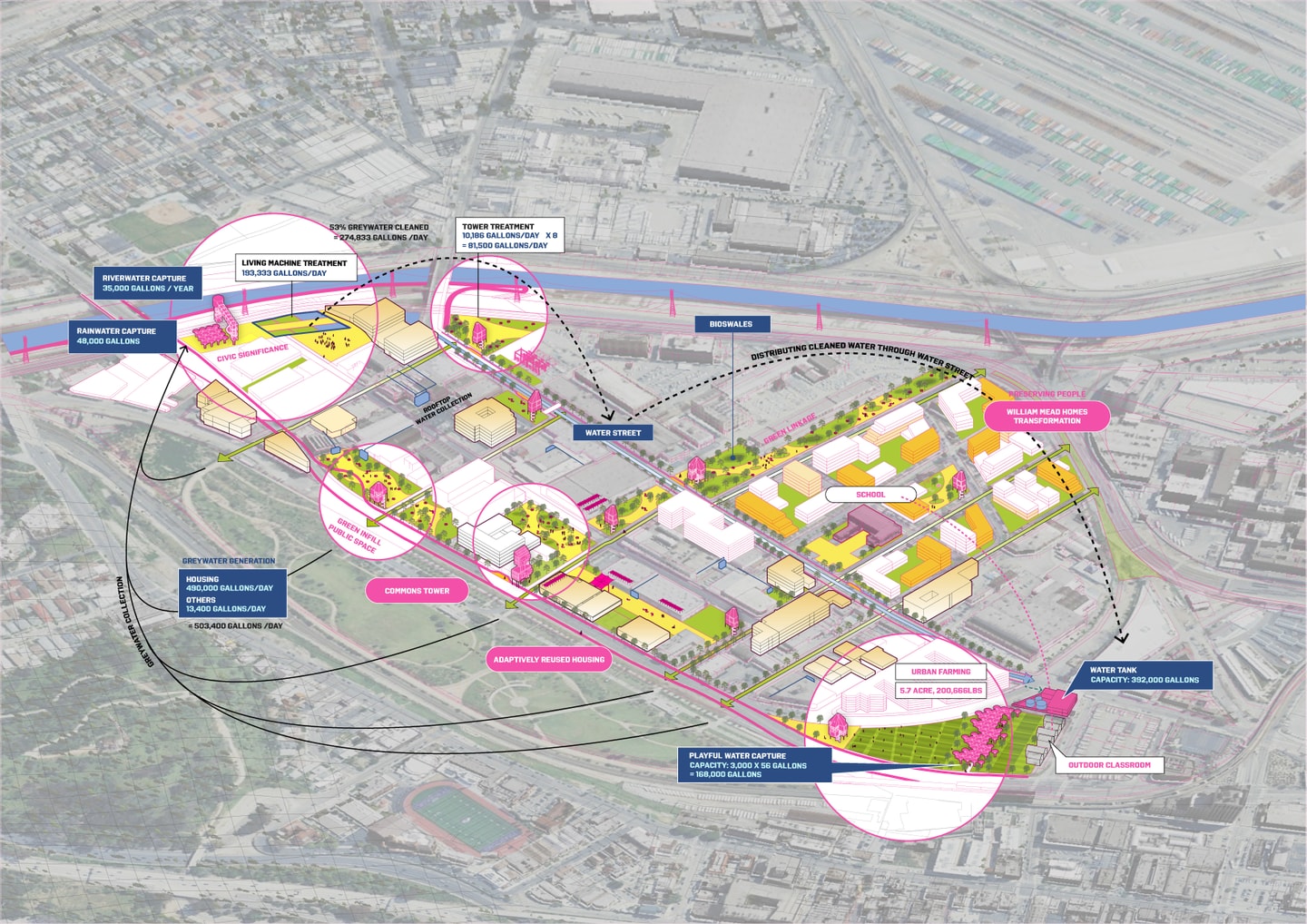 The project leverages hidden resources—vacant lots, buildings, and greywater—to build infrastructure in two phases: 2028 for the Olympics and 2050 for the Next Generation. Vacant buildings become volunteer and then affordable housing; lots turn into Commons Tower, Water Street, and pocket parks. Located near William Mead Homes and south of LA State Historic Park, the project resists market-rate redevelopment, preserves historic assets, and addresses displacement, construction waste, and environmental issues like water scarcity and urban heat.