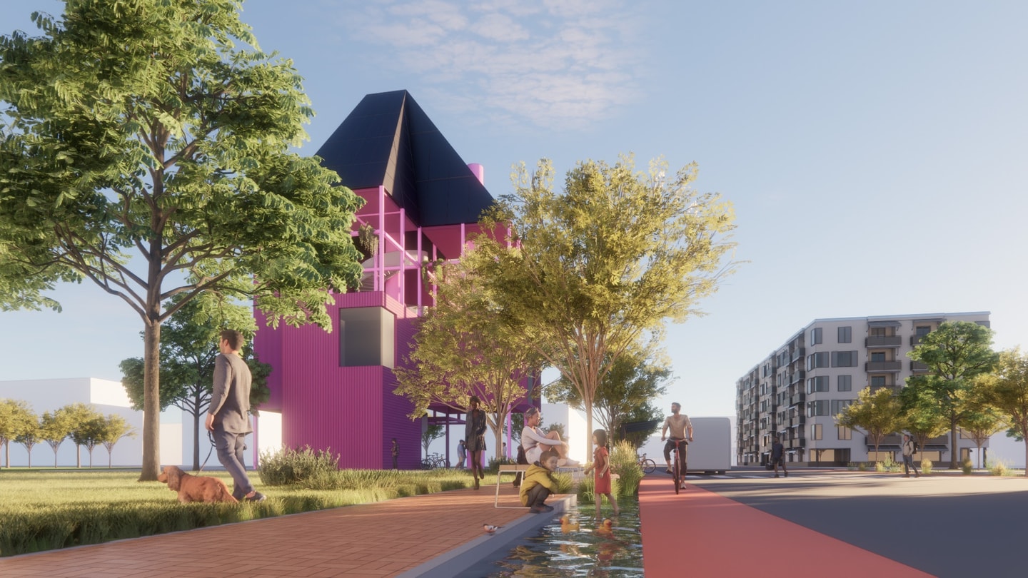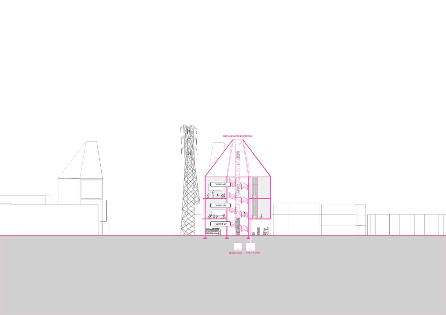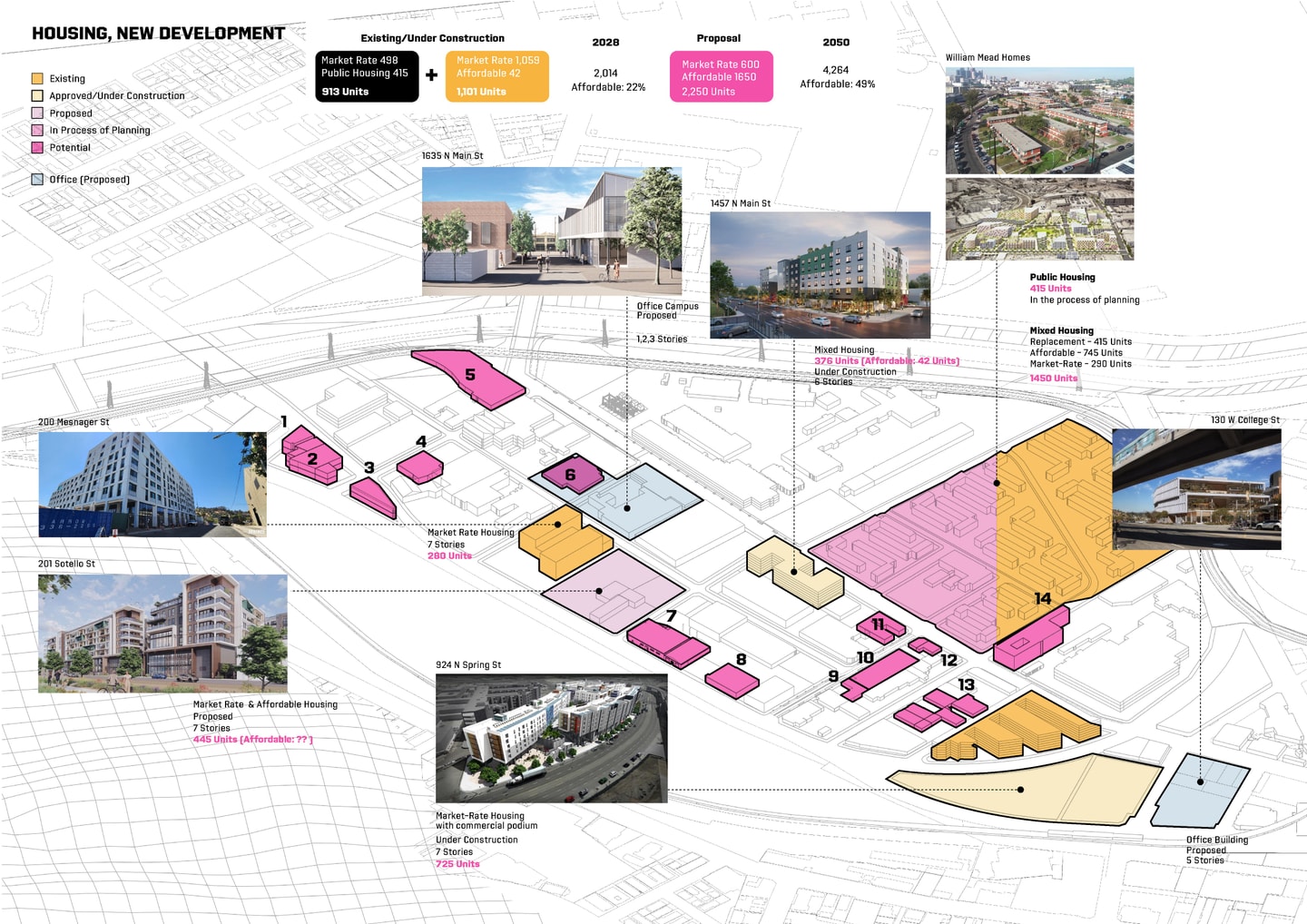 The project leverages hidden resources—vacant lots, buildings, and greywater—to build infrastructure in two phases: 2028 for the Olympics and 2050 for the Next Generation. Vacant buildings become volunteer and then affordable housing; lots turn into Commons Tower, Water Street, and pocket parks. Located near William Mead Homes and south of LA State Historic Park, the project resists market-rate redevelopment, preserves historic assets, and addresses displacement, construction waste, and environmental issues like water scarcity and urban heat.